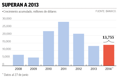 Y así, se han rebasado los 13 mil 6 millones de dólares que se almacenaron en todo el 2013, de mantener este mismo ritmo durante la segunda mitad del año posiblemente se alcancen los 21 mil 40 millones de dólares que se acumularon en 2012.
