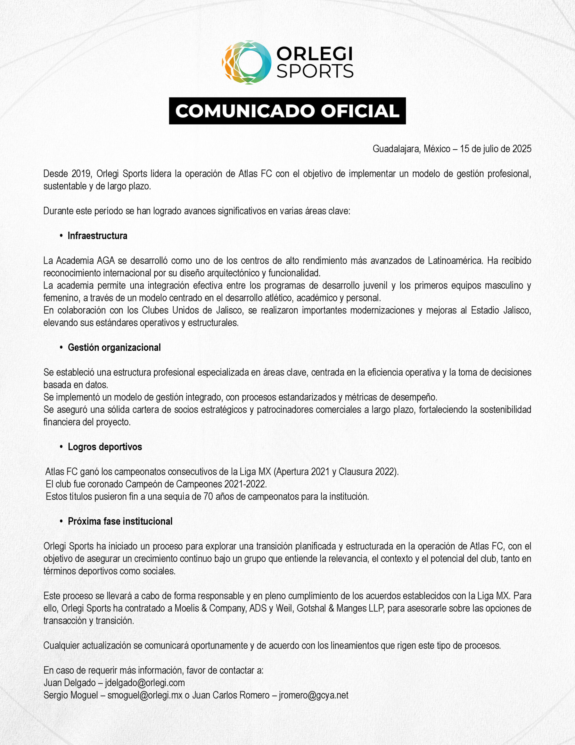 La decisión marca un paso firme en el camino para erradicar la multipropiedad en la Liga MX, pues Orlegi conservará únicamente al Santos Laguna. “Orlegi Sports ha iniciado un proceso para explorar una transición planificada y estructurada en la operación de Atlas FC”, explicó el grupo en un comunicado.