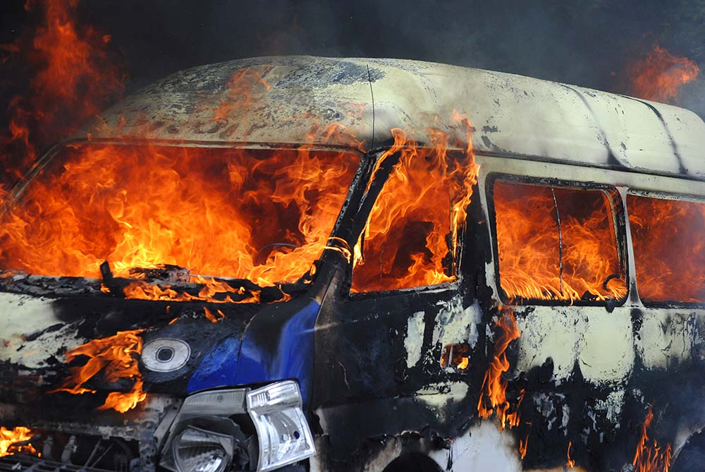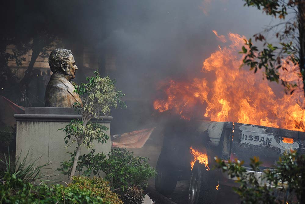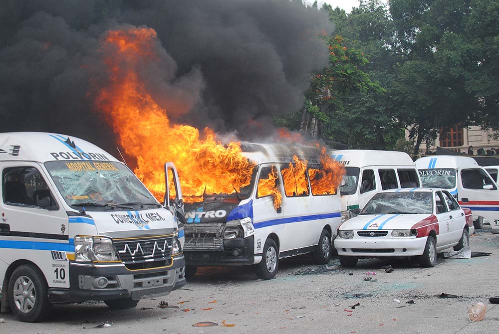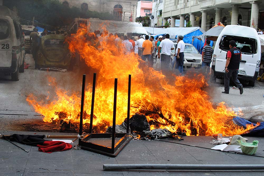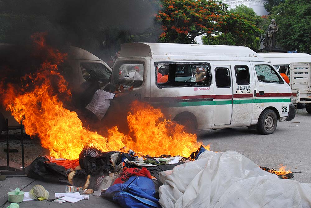Al mismo tiempo que transportistas eran golpeados, otro grupo de los encabezados por la COSTEG destruyeron las casas de campaña ubicadas en la plaza de armas y prendieron fuego a una combi y un taxi que se encontraban ahí estacionados.