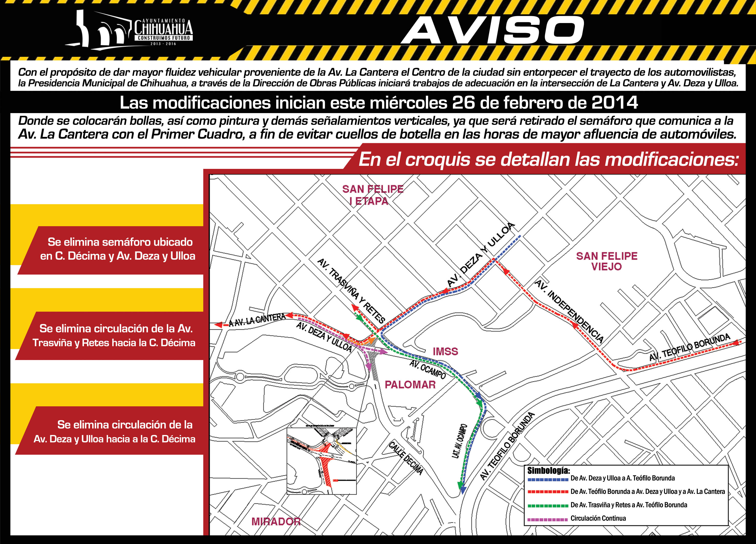 Con el propósito de dar mayor fluidez vehicular proveniente de la Avenida La Cantera el Centro de la ciudad sin entorpecer el trayecto de los automovilistas, la Presidencia Municipal de Chihuahua, a través de la Dirección de Obras Públicas iniciará trabajos de adecuación en la intersección de La Cantera y avenida Deza y Ulloa.