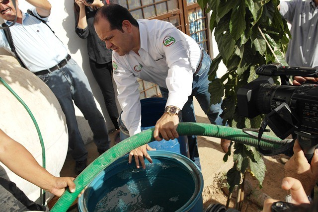 El presidente de la Junta Municipal de Agua y Saneamiento (JMAS), Maurilio Ochoa Millán, encabezó el banderazo de arranque del Programa Refuerzo Verano 2014 en la colonia Los Mezquites, acompañado por un nutrido grupo de vecinos, así como del personal de la JMAS, el funcionario estatal supervisó e incluso participó en los trabajos correspondientes al abastecimiento de agua a través de 20 pipas con capacidad de 20 y 10 mil litros, que fueron utilizadas para llevar el agua a cientos de familias que habitan en esta colonia, así como las aledañas: 11 de Febrero, Ladrilleras y Ejido Carrizalillo, dando cumplimiento de esta manera al abastecimiento diario de hasta 3 millones 800 mil litros en las colonias, como apoyo a la ciudadanía ante el incremento de las temperaturas en esta ciudad capital.