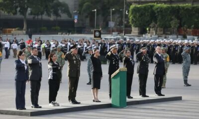 La presidenta Claudia Sheinbaum Pardo encabezó la ceremonia de izamiento de la bandera a media asta en el Zócalo capitalino en honor a la memoria de...