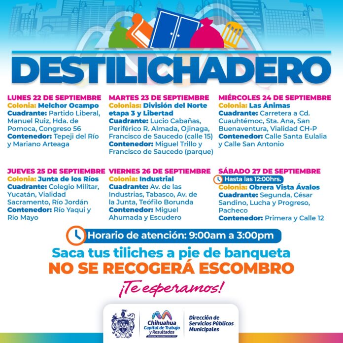 Con el objetivo de evitar acumulación de desechos voluminosos en los hogares —los llamados “tiliches”— que puedan generar plagas o problemas de salud, el Gobierno Municipal de Chihuahua dio a conocer el calendario del programa Destilichadero, que se llevará a cabo del 22 al 27 de septiembre en siete colonias de la capital.