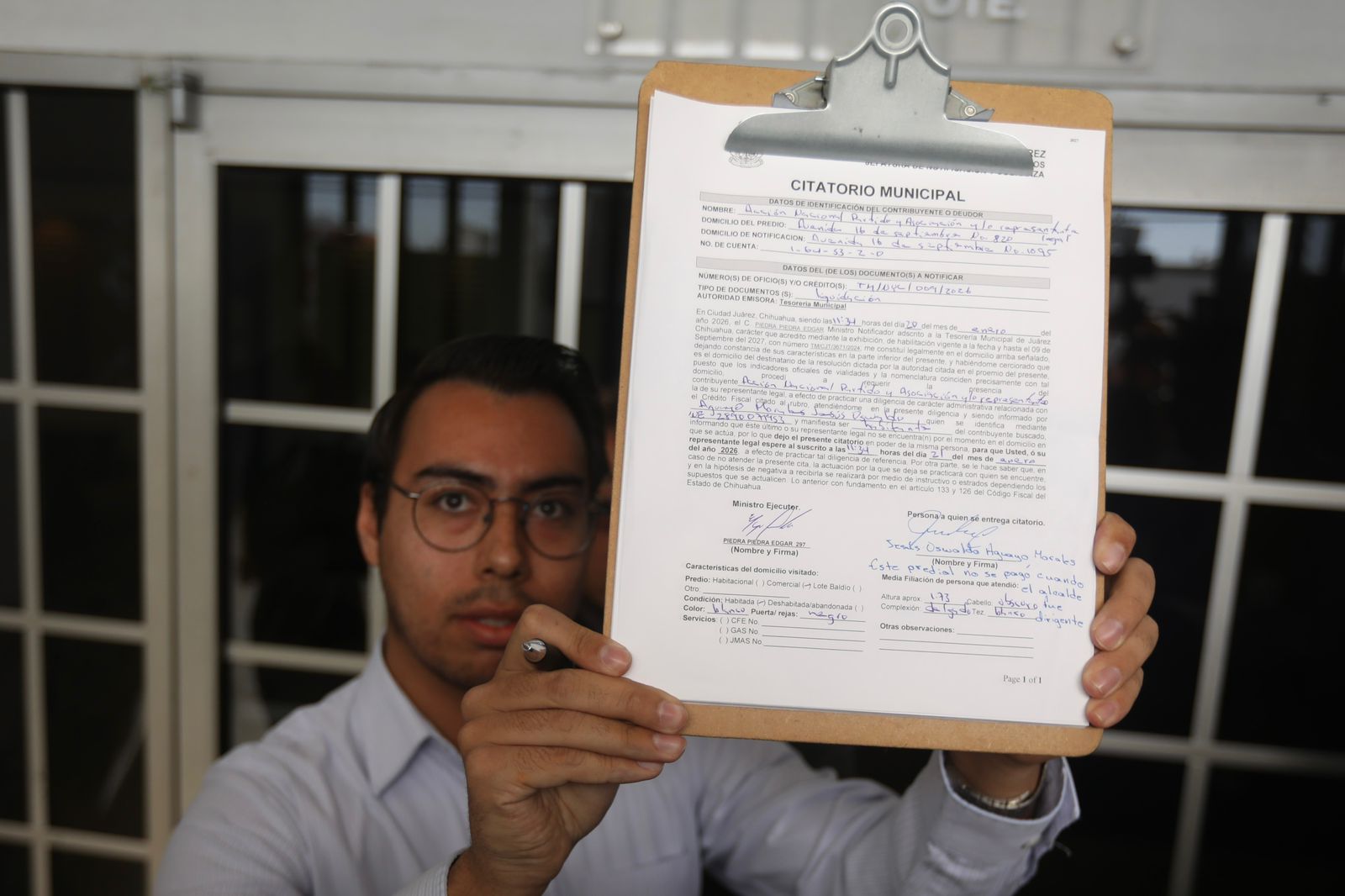 El Gobierno Municipal llevó a cabo este día la entrega de citatorios municipales por los edificios que albergan a los partidos Acción Nacional y Revolucionario Institucional, como parte del procedimiento legal por los adeudos que presentan en el pago del Impuesto Predial.