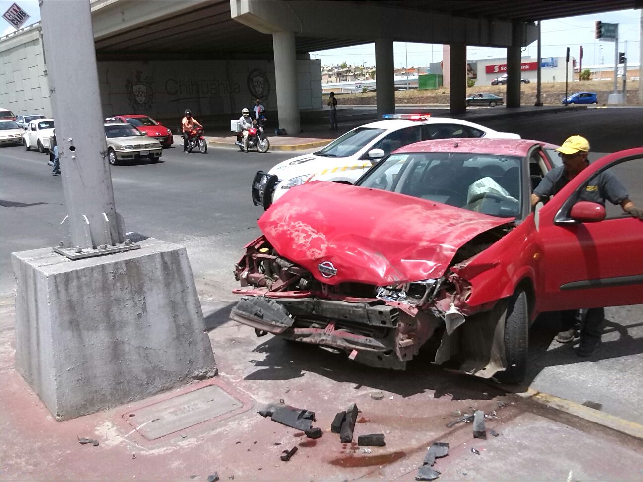 Por pasarse el alto, el conductor de una camioneta vuelca al colisionar con un auto compacto, proyectándolo hacia el poste del semáforo del periférico de La Juventud y avenida Francisco Villa.