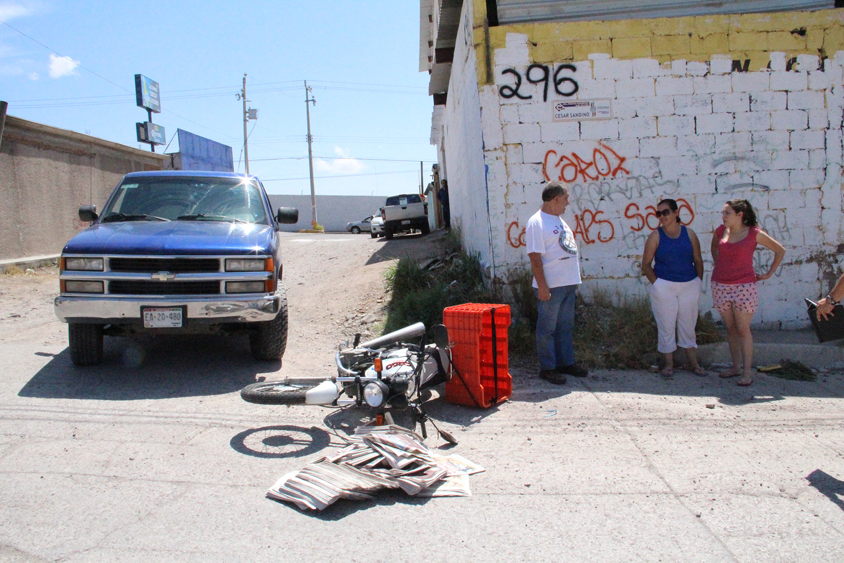 Un repartidor motociclista fue impactado por una troca que se pasó el alto en las calles Arcanos y César Sandino, en la colonia Ignacio Rodríguez; fue trasladado a un hospital.