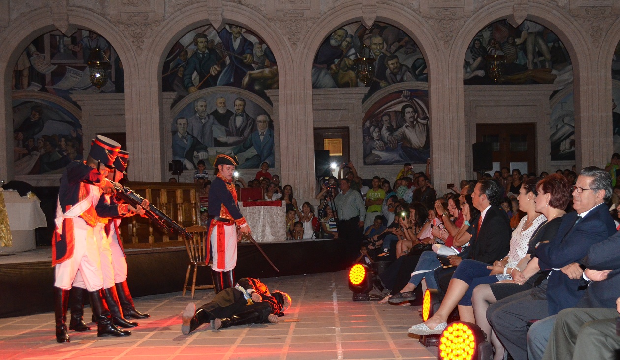 El evento en el que se dieron cita cerca de mil 200 personas, dio inicio a las ocho de la noche en el patio central del Palacio de Gobierno donde se montó la escenografía y fueron colocadas gradas para 800 personas y cerca de 300 sillas, además de dos pantallas en la parte exterior frontal del palacio donde se transmitió la representación teatral.