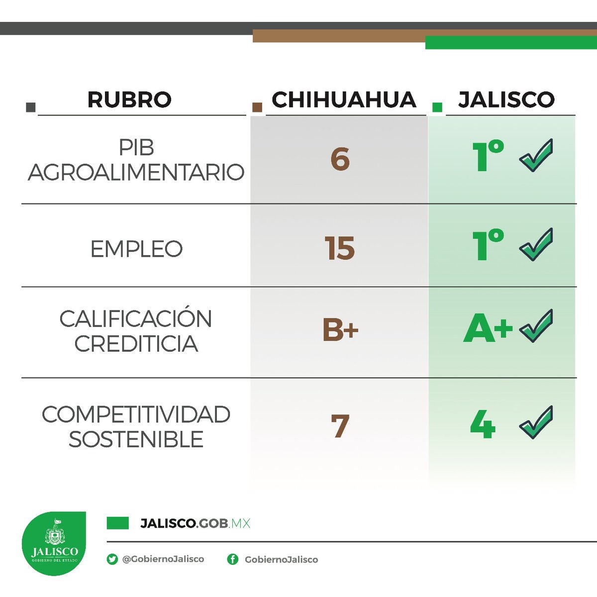 A continuación publicó una imagen (cuya fuente no se indicó) donde Jalisco se encuentra en primer lugar en producto interno bruto agroalimentario y en empleo, mientras que Chihuahua está en los lugares seis y 15, respectivamente; un cuarto lugar de Jalisco en competitividad contra un nada lejano séptimo sitio de Chihuahua; y una calificación crediticia de este estado de A a comparación de una B de la entidad norteña.