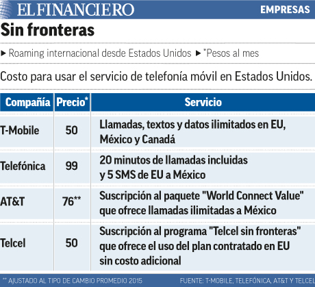 Por su parte, T-Mobile anunció esta semana que sus clientes en Estados Unidos podrán hablar, enviar mensajes de texto y navegar por internet en Canadá y México sin cargos adicionales.