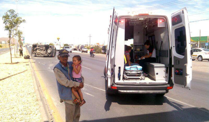 Una mujer y una menor de edad resultaron con lesiones leves luego de un choque volcadura registrado en las calles 45 y Desarrollo, frente a Bodega Aurrera al norte de la ciudad.