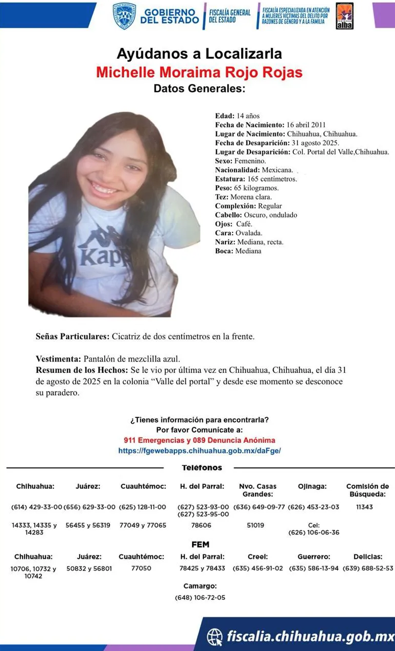 La Fiscalía General del Estado y la Comisión Local de Búsqueda solicitaron el apoyo de la ciudadanía para dar con el paradero de Michelle Moriyama Rojo Rojas, una adolescente de 14 años que fue vista por última vez el 31 de agosto de 2025 en la colonia Portal del Valle, en la ciudad de Chihuahua.