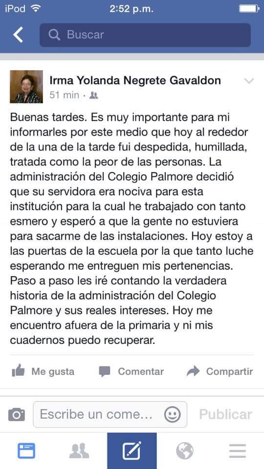 Quien fuera la directora del Colegio Palmore Irma Yolanda Negrete Gavaldón y que por 40 años presto sus servicios a esta institución educativa , hoy fue despedida de sus labores de forma arbitaria, así lo dio a conocer a través de su red social.