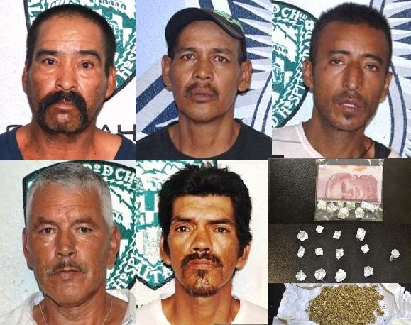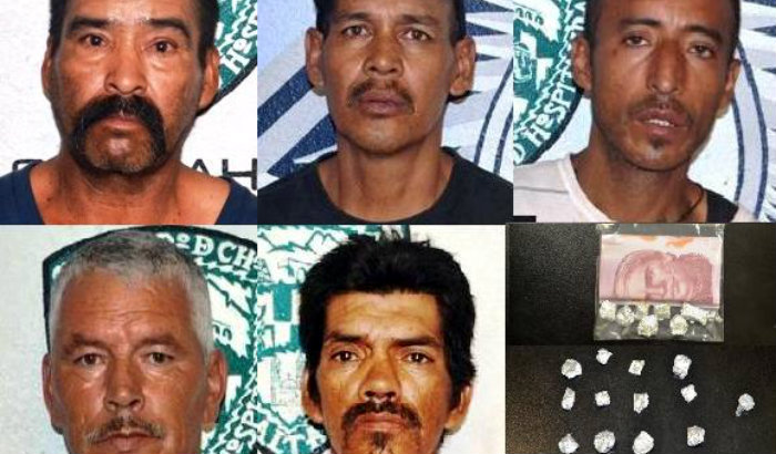 En la Avenida Zarco fueron ubicados OSCAR SOTELO CHÁVEZ DE 43 AÑOS, HERIBERTO FIERRO MAGALLANES DE 53 Y ARNOLDO FÉLIX VILLALOBOS DE 49, cuando realizaban compra venta de droga en la vía pública, al ser revisados les localizaron entre sus pertenencias 07 porciones de una sustancia de apariencia oscura y gomosa con las características opiáceas de la heroína.