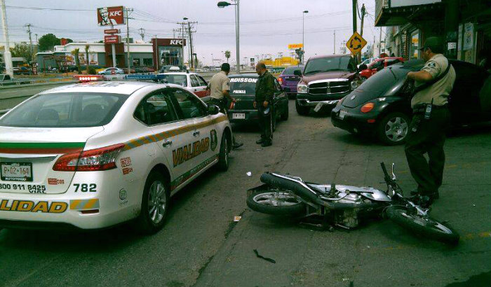 De acuerdo a la información obtenida en el lugar de los hechos la unidad Dodge Ram con matrículas de circulación DZ9-2327 circulaba en sentido contrario por la Silvestre Terrazas a la altura del Circuito Tricentenario al parecer se encontraba en medio de un operativo, desafortunadamente el conductor de la moto con placas CWT-19 no alcanzó a observar al vehículo y fue embestido.