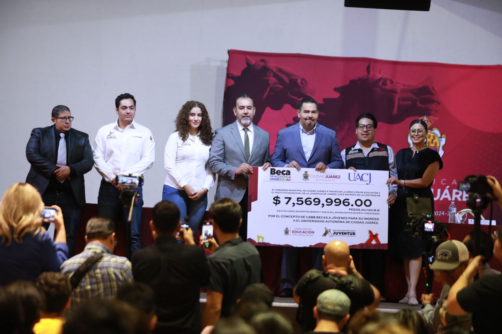 El Gobierno Municipal, a través del Instituto Municipal de la Juventud, entregó de manera simbólica un cheque por 7 millones 569 mil 996 pesos a la Universidad Autónoma de Ciudad Juárez (UACJ), como parte del Programa Becas de Acceso a la Universidad.