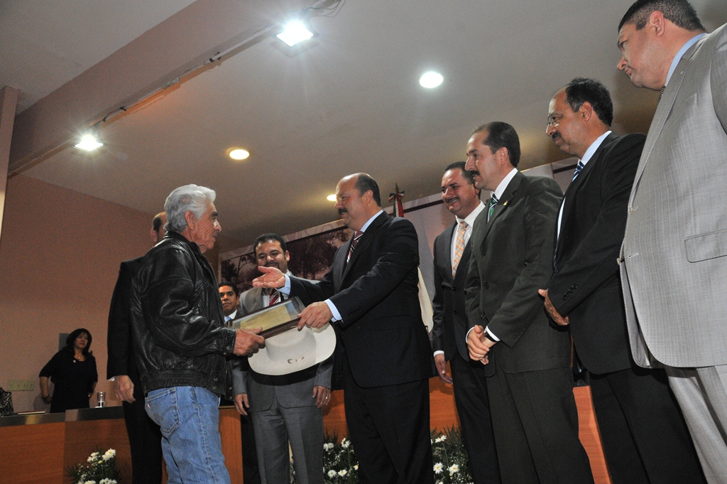 En el marco de la sesión solemne del Congreso del Estado con motivo del 103 Aniversario de la Batalla de Casas Grandes. el gobernador del Estado, César Duarte Jáquez, entregó el reconocimiento como “Chihuahuense Distinguido” al ceramista Juan Quezada Celado, por su trayectoria como artesano creador de las mundialmente reconocidas vasijas de Paquimé.