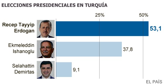 Recep Tayyip Erdogan será el nuevo presidente de la República Turca sin que haga falta siquiera una segunda ronda. Con el 93,79% de los votos escrutados, la victoria del aún primer ministro está asegurada, al lograr el 53,1% de los votos.