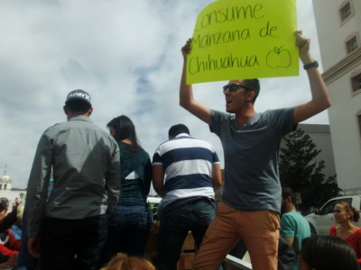 Ante la sobre producción de manzana y la falta de lugares para comercializarla, estudiantes de Faciatec se pusieron a un lado de la Plaza del Angel, regalando bolsas de este producto proveniente de Cuauhtemoc, invitando a los Chihuahuenses a preferir el producto local que la de Estados Unidos.