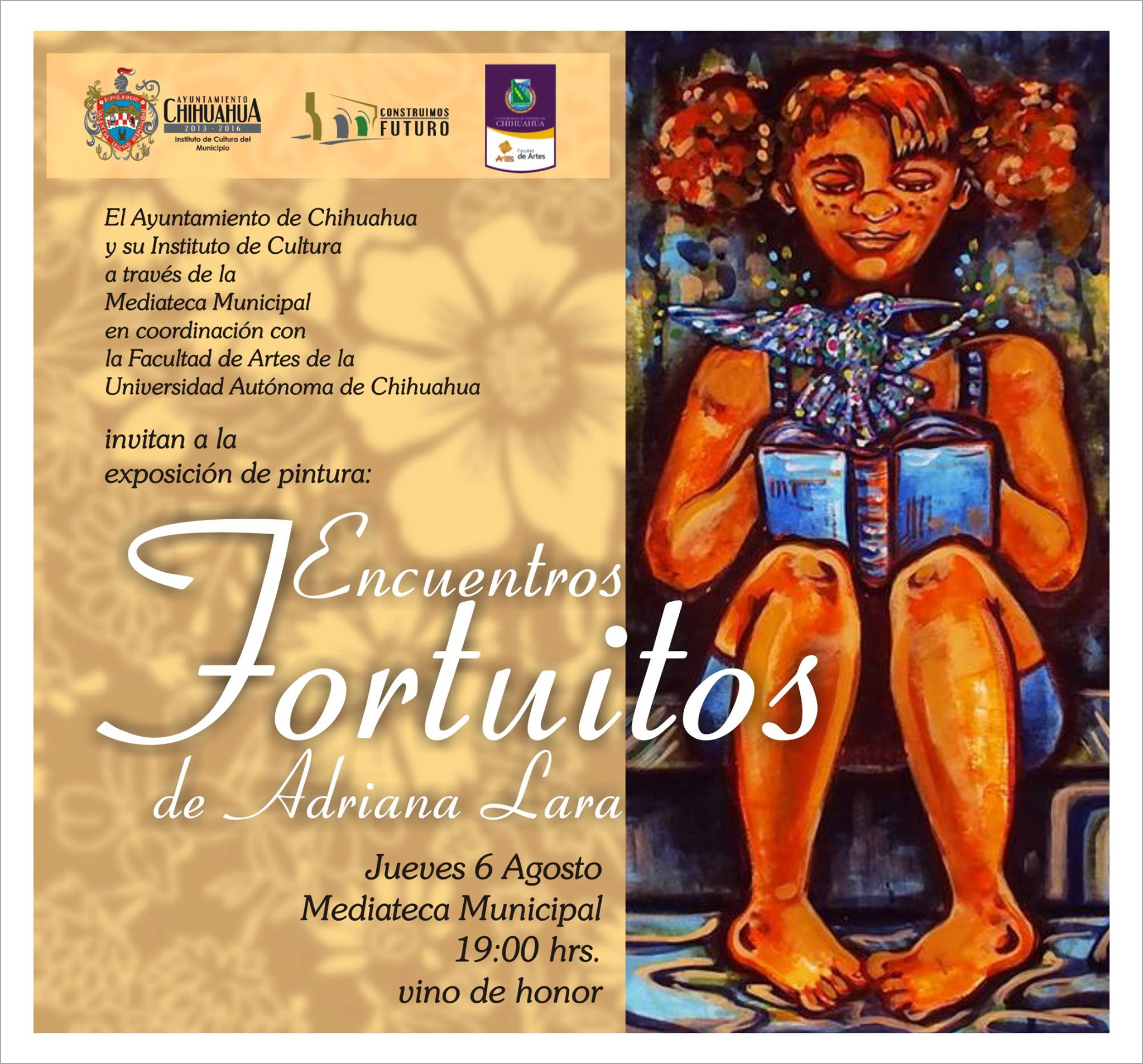 Artes y Humanidades del CEDART “David Alfaro Siqueiros” y posteriormente laLicenciatura en Artes en la hoy Facultad de Artes de la UACH. Beneficiaria de la becaDavid Alfaro Siqueiros que otorga el ICHICULT, tiene ya una importante trayectoria através de las exposiciones individuales y colectivas que ha realizado, por las que se hadado a conocer en el medio artístico de esta ciudad y del país. Entre ellas destacan lasrealizadas en el Museo Casa de Juárez, la Casa Siglo XIX, Congreso del Estado, en estaciudad; Museo Paso del Norte, en Ciudad Juárez, Chih., la Galería Curiel, en Xalapa,Veracruz, y recientemente en el Museo Dolores Olmedo de la Ciudad de México.Para Adriana Lara el arte es una herramienta de autoconocimiento. En esta exposición“Encuentros Fortuitos”, refiere las coincidencias y sincronías que el destino, a manera debroma o azar nos presenta y aborda varios tipos de encuentros a través de una diversidadde símbolos y atribuciones: animales, objetos y abstracciones.Se hace una cordial invitación a todo el público para que asista a esta Exposición queseguramente será una experiencia muy interesante ya que el lenguaje pictórico de estajoven artista, es innovador y se adentra en un universo de múltiples imágenes y coloridoque provoca nuevas emociones y que reta al espectador a entrar en esos “EncuentrosFortuitos” que describe la autora con su arte.La Mediateca está ubicada en Av. Teófilo Borunda e Independencia de esta ciudad.