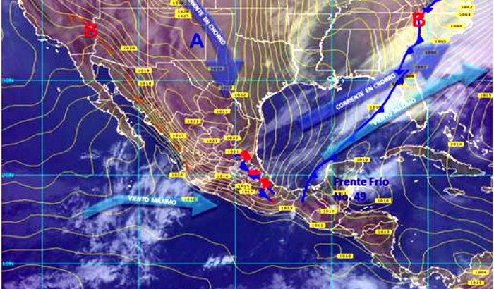 Frente frío No. 49, se extiende desde un centro de baja presión sobre Mississippi, E.U.A., pasando por el noroeste del Golfo de México hasta Veracruz, Hidalgo y San Luis Potosí. El sistema frontal, su masa de aire frío y un canal de baja presión asociado provocarán los siguientes efectos: