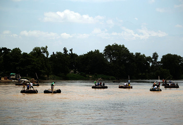 A lo largo del Río Suchiate, que marca la frontera entre Guatemala y México, Wilmer Pérez, de 22 años, transporta a sus clientes en una balsa fabricada con cámaras de neumáticos, cobrando menos de un dólar por pasajero.