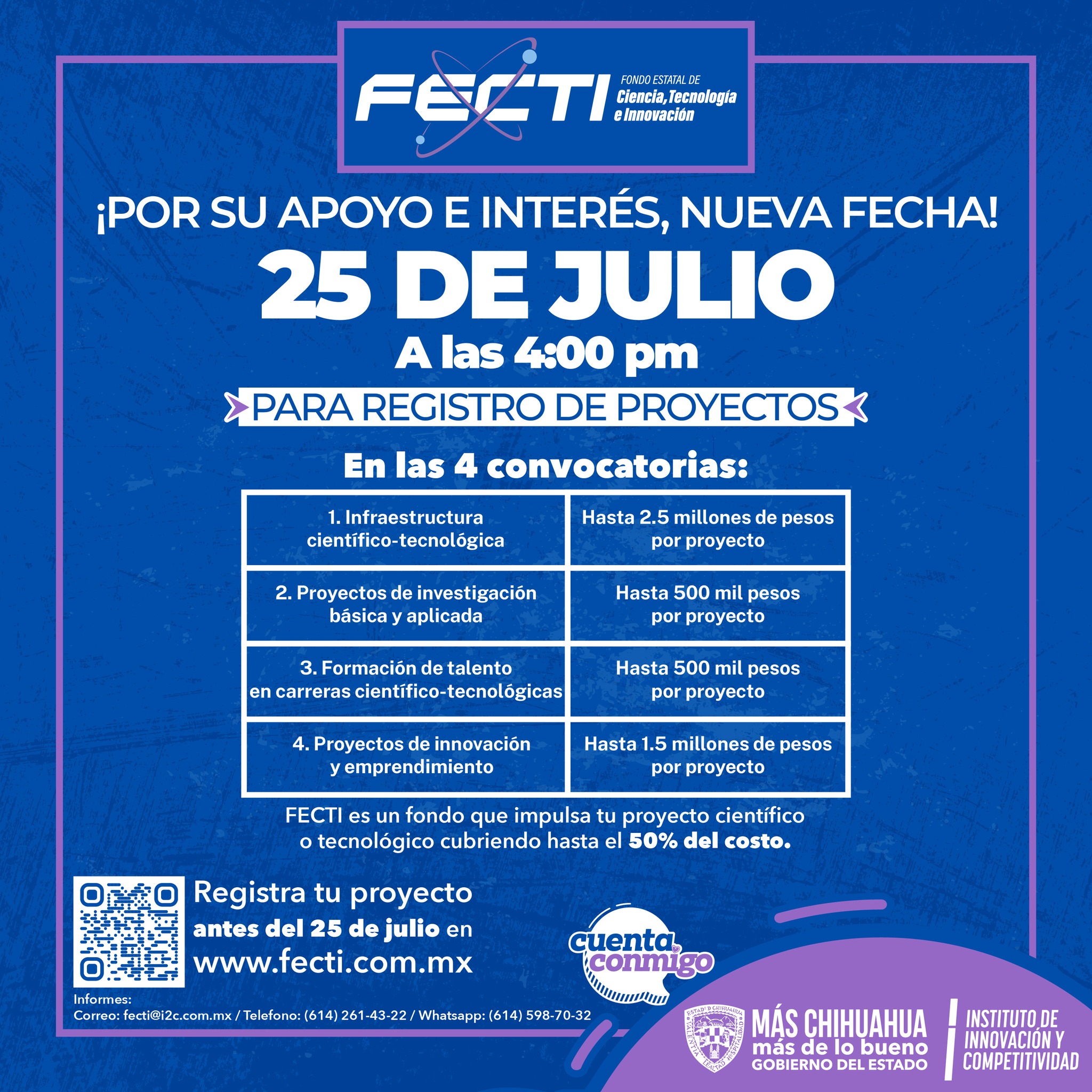 El cierre de la convocatoria será el viernes 25 de julio de 2025 a las 16:00 horas en la plataforma digital www.fecti.com.mx, con el propósito de brindar mayores oportunidades de participación.
