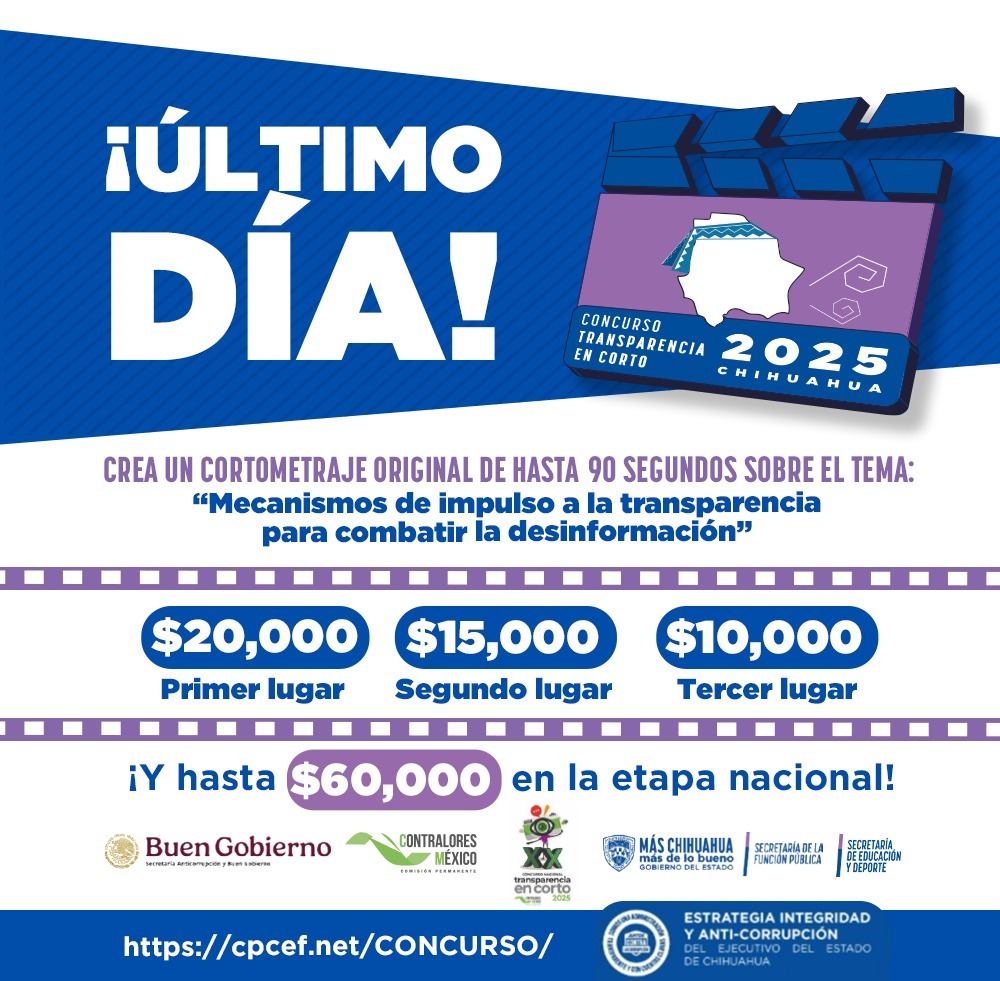 Las bases completas del concurso pueden consultarse en el siguiente enlace: https://www.chihuahua.gob.mx/prensa/bases-del-concurso-transparencia-en-corto-2025-chihuahua/
