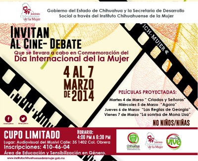 En el marco de las actividades del Día Internacional de la Mujer, el Centro para la Prevención y Atención a Mujeres en Situación de Violencia (Musivi) dio a conocer que del 4 al 7 de marzo se llevará a cabo la proyección de cuatro películas para la reflexión y discusión de los estereotipos y roles que afectan a mujeres y hombres.
