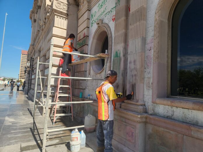 La Presidencia Municipal de Chihuahua inició este martes los trabajos de limpieza y restauración en la fachada del edificio, luego de los daños ocasionados durante la manifestación antitaurina registrada el pasado 6 de septiembre.
