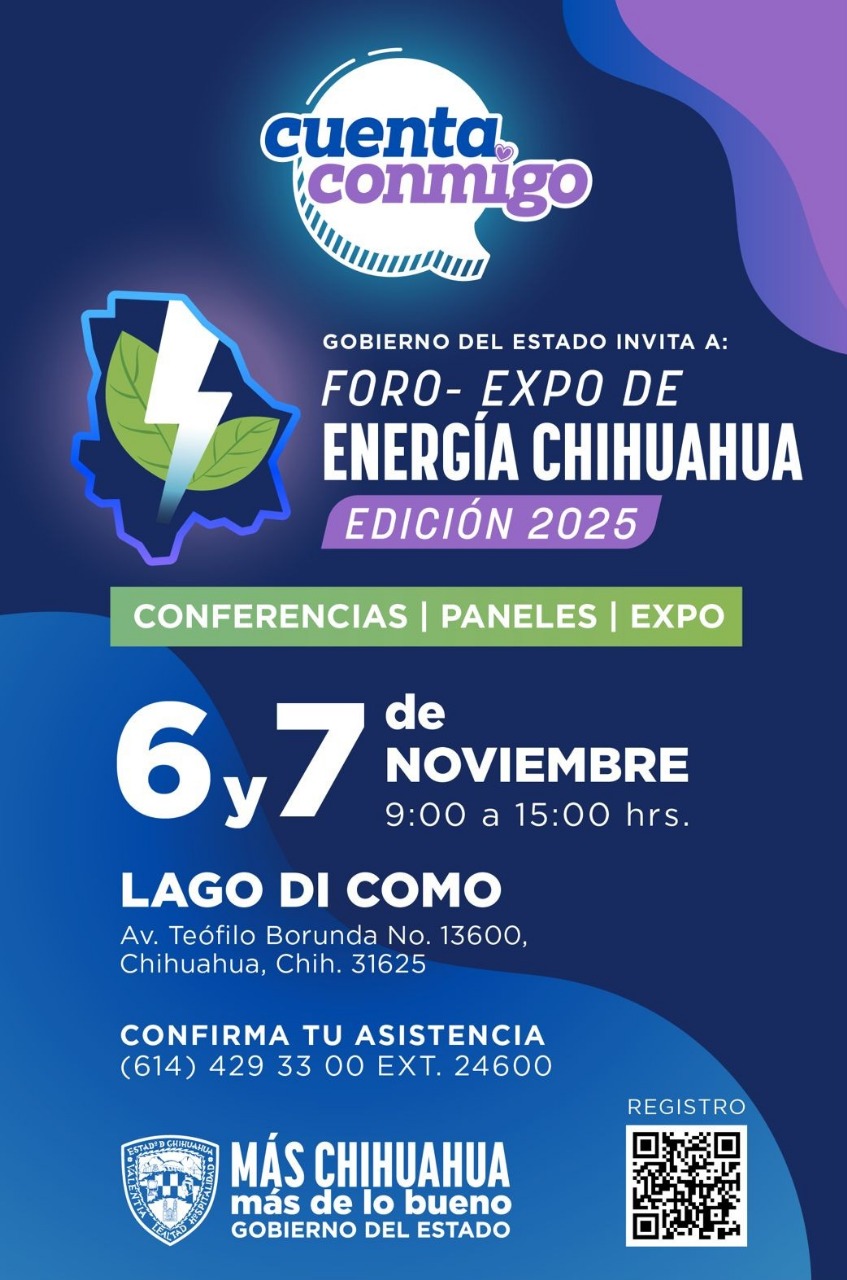 El Gobierno del Estado, a través de la Secretaría de Innovación y Desarrollo Económico (SIDE) invita al Foro-Expo de Energía Chihuahua 2025, a efectuarse el 6 y 7 de noviembre en el salón Lago Di Como de la capital, con entrada gratuita.
