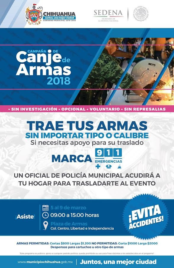 Con el fin evitar accidentes producidos por arma de fuego y disminuir su circulación, el Gobierno Municipal a través de la Dirección de Desarrollo Humano y Educación por conducto del Departamento de Acción Cívico y Social, Seguridad Pública Municipal, Secretaría del Ayuntamiento y la V Zona Militar, invitan a los ciudadanos a la campaña de Canje de Armas.