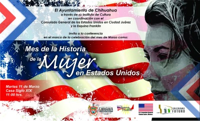 El Ayuntamiento de Chihuahua, por medio del Consulado General de los Estados Unidos de Ciudad Juárez, el Instituto de Cultura del Municipio, en coordinación con la Esquina Benjamín Franklin, invita a la ciudadanía a la conferencia en el marco de la celebración del mes de marzo como; “Mes de la Historia de la Mujer en Estados Unidos”, el martes 11 de marzo, en las instalaciones de la Casa Siglo XIX a las 11:00 horas.