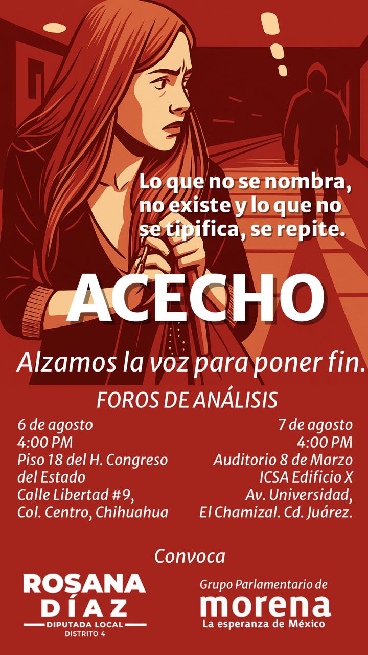 Chihuahua, Chih., La Diputada por Morena, Rosana Díaz Reyes, invitó a los colectivos de mujeres, organizaciones de abogadas y abogados y a la ciudadanía en general a los foros de análisis sobre el acecho que se estarán celebrando durante esta semana en Chihuahua y Juárez.
