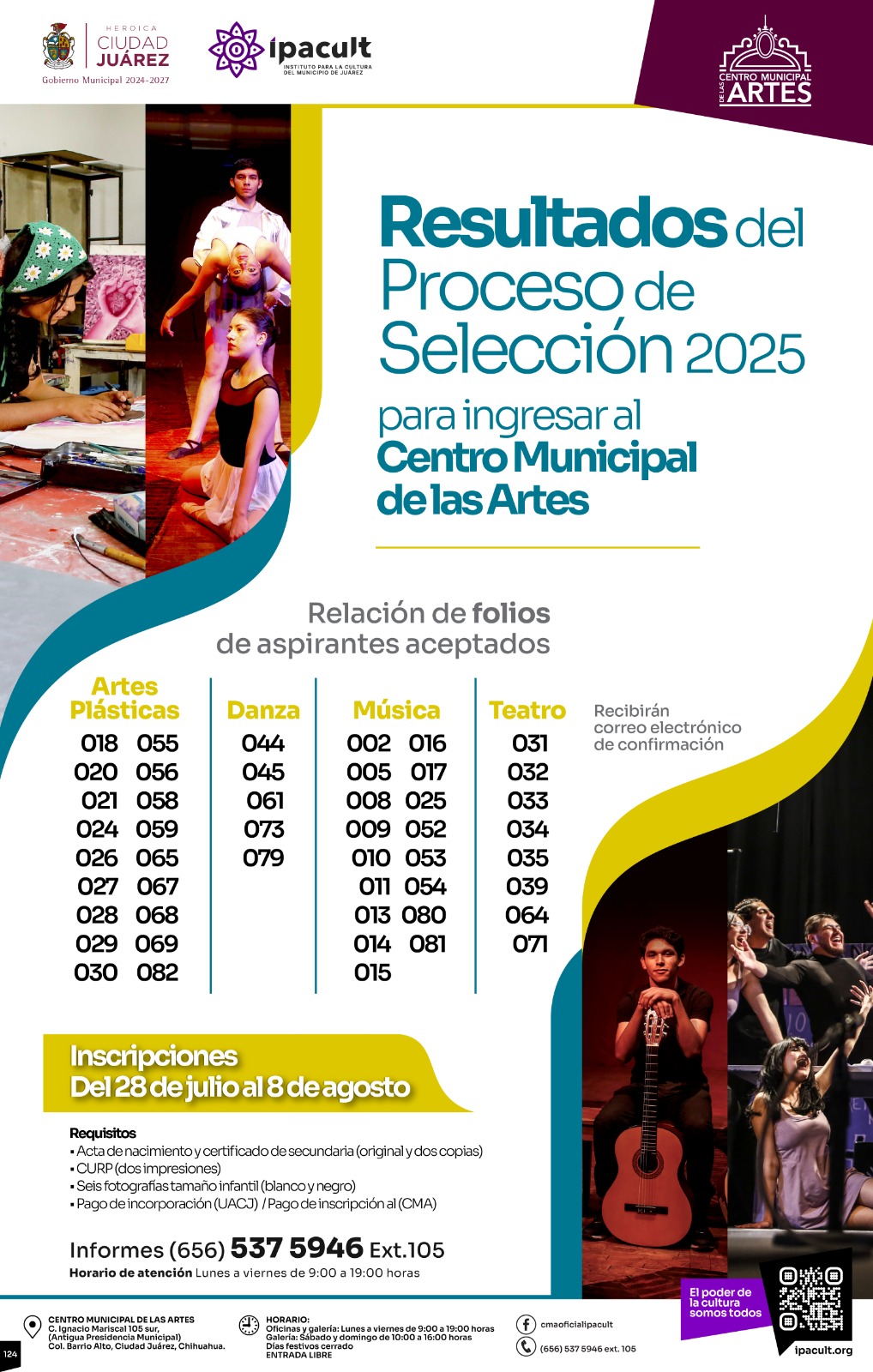 El Instituto para la Cultura del Municipio de Juárez (IPACULT) informa a la comunidad los resultados del proceso de selección para ingresar a las carreras técnico-profesionales de artes plásticas, danza, música y teatro que se imparten en el Centro Municipal de las Artes (CMA).