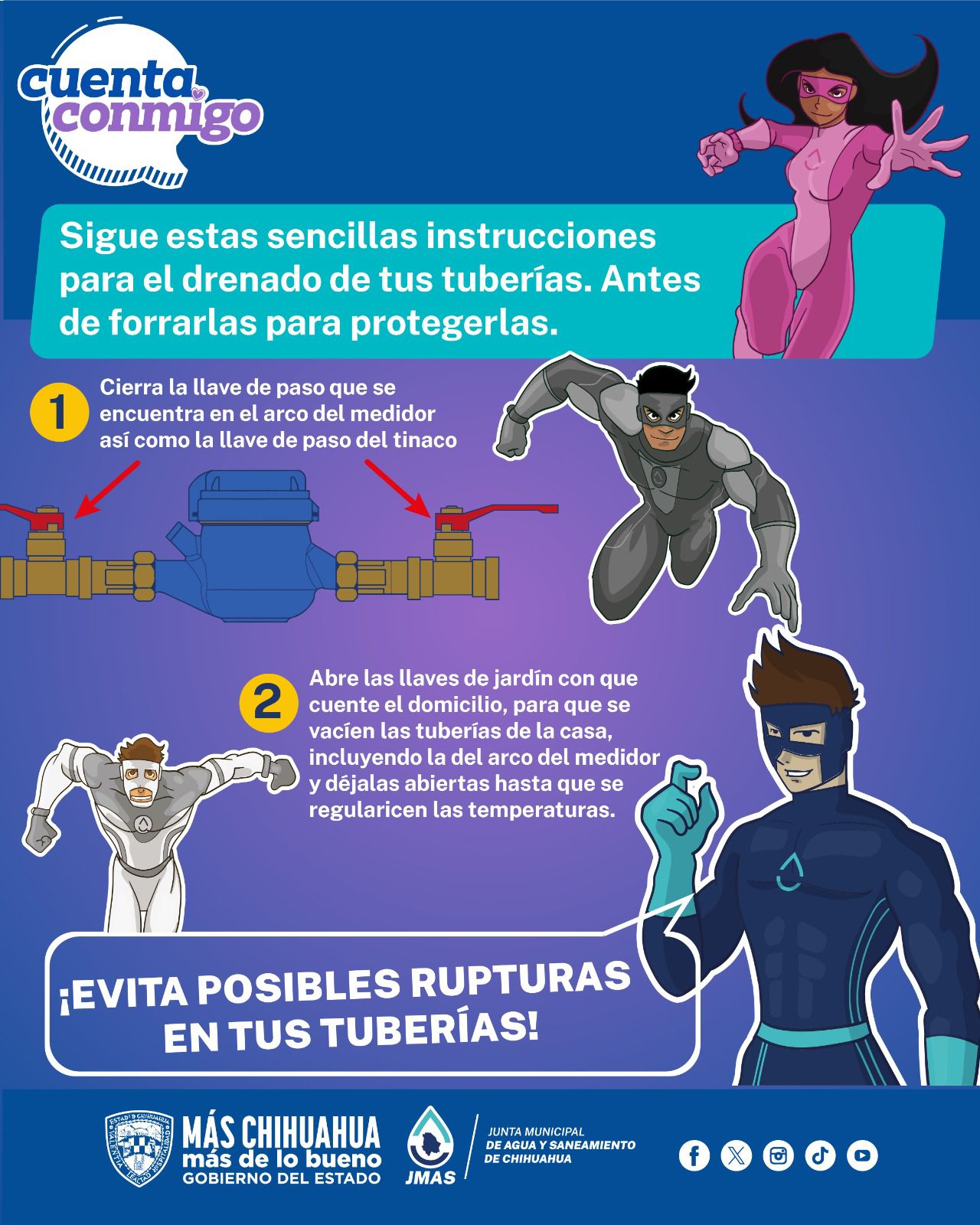 La Junta Municipal de Agua y Saneamiento de Chihuahua exhortó a la ciudadanía a proteger las tuberías de agua en sus domicilios ante las bajas temperaturas que se registran este fin de semana en la entidad, con el fin de prevenir rupturas y afectaciones en el servicio.