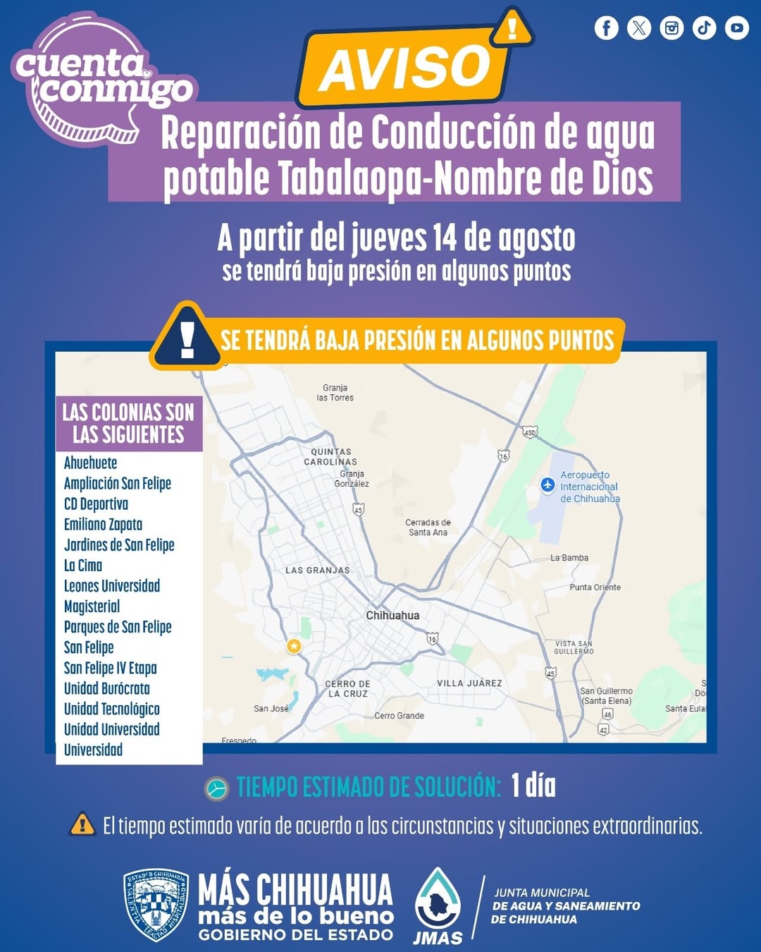 La Junta Municipal de Agua y Saneamiento (JMAS) de Chihuahua realizará este jueves 14 de agosto trabajos de reparación en una fuga detectada en el conducto de agua potable Tabalaopa–Nombre de Dios.