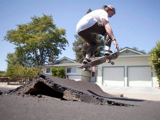Jóvenes skaters de la ciudad de Napa, la más afectada por el terremoto de 6 grados de magnitud que sacudió a California este domingo, le están sacando provecho a los estragos que dejó por el sismo.