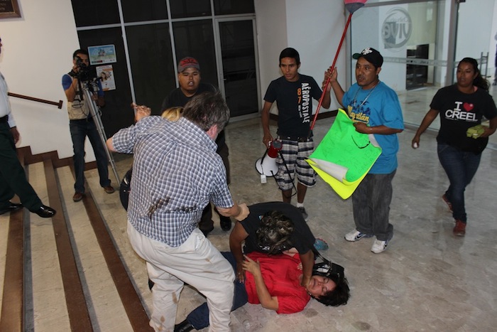 La sorpresa fue que un grupo de choque del PRI, encabezado por Reyna Arellanes, comenzó a agredir a los manifestantes y a quitar las escobas que llevaban para representar la limpia de Hacienda; les aventaron huevos, les gritaron insultos y golpearon a dos, entre ellos a una mujer.