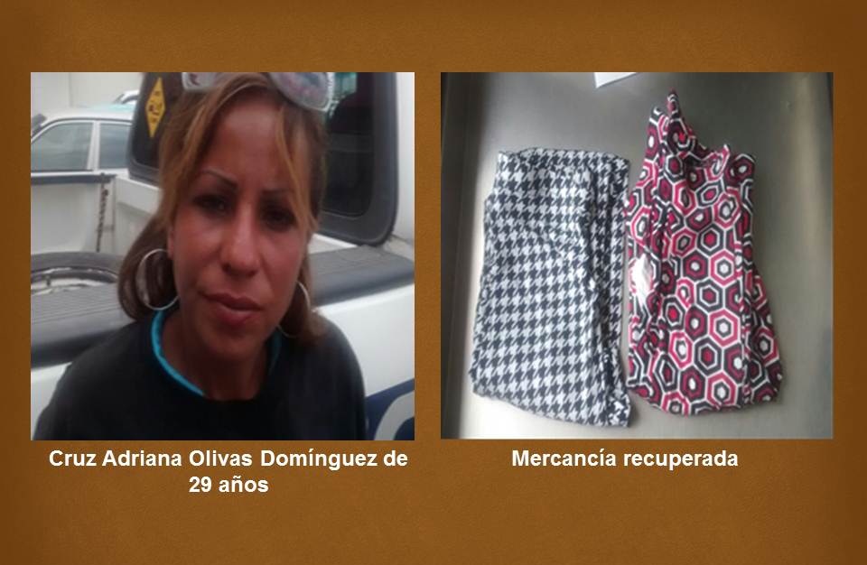 Elementos de la Dirección de Seguridad Pública Municipal remitieron a quien dijo llamarse Cruz Adriana Olivas Domínguez de 29 años de edad, por el probable delito de robo a un local comercial ubicado en la colonia Mármol.