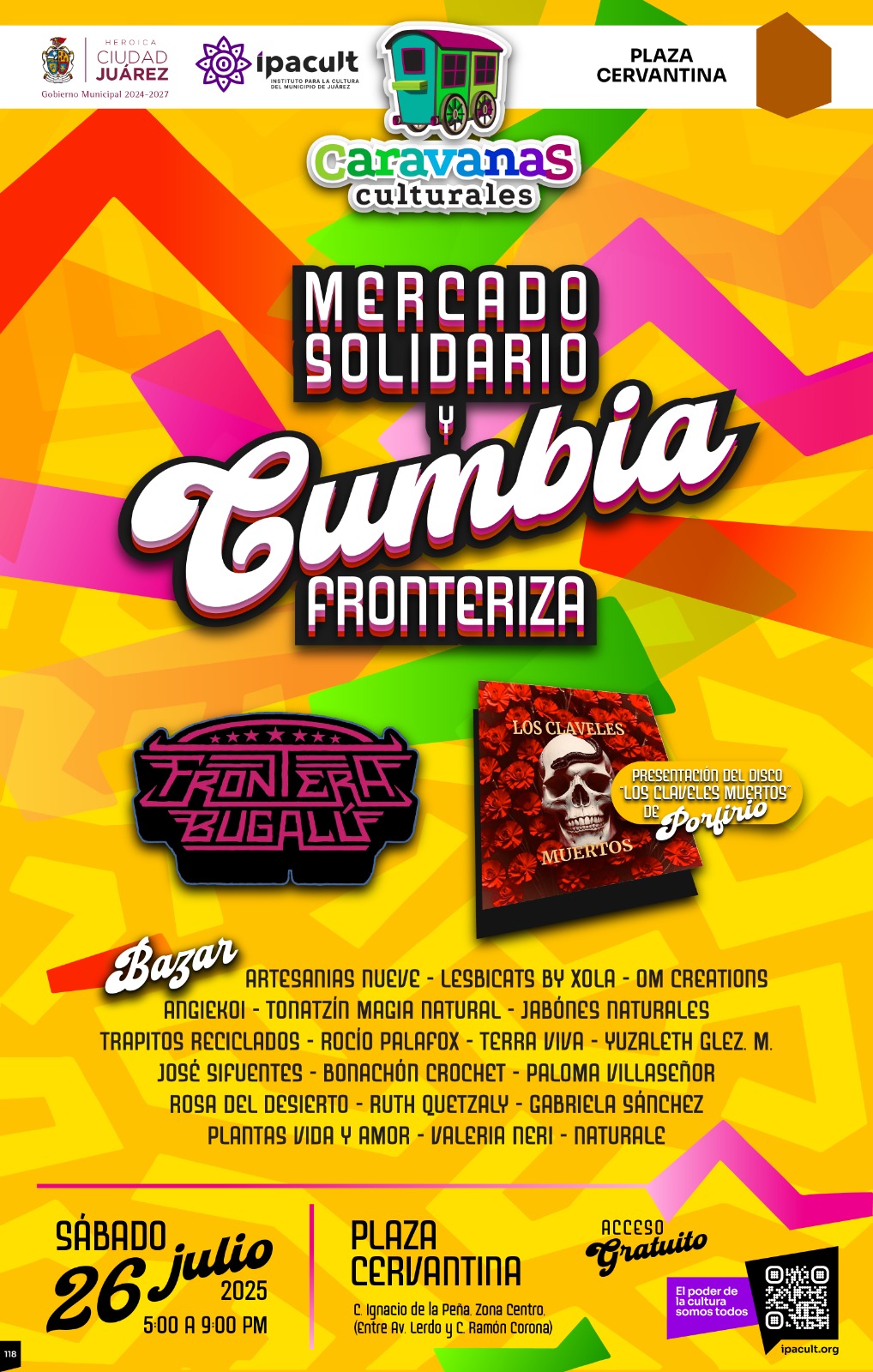 El Instituto para la Cultura del Municipio de Juárez (IPACULT) llevará este fin de semana su programa Caravana Cultural “Mercado Solidario y Cumbia Fronteriza” a la Plaza Cervantina, un espacio emblemático del Centro Histórico que se transformará en punto de encuentro para la música, el arte y el talento local.