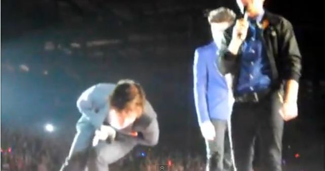 Gracioso golpe recibe el cantante de One Direction Harry Styles en uno de sus conciertos.