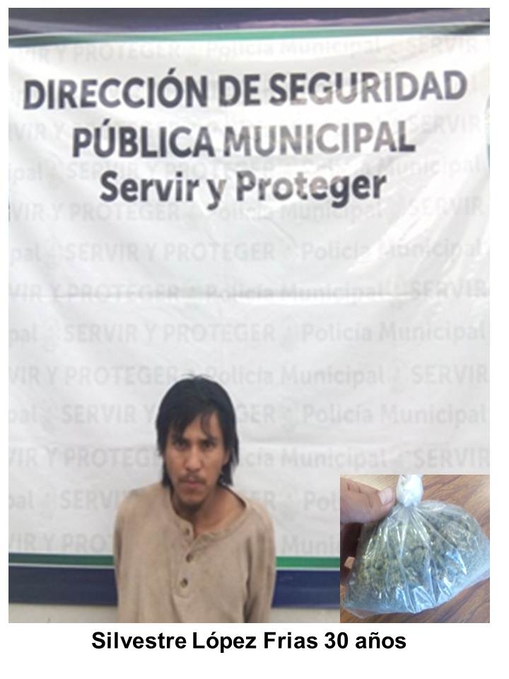 Por lo que los uniformados comenzaron un recorrido de búsqueda y localización, calles más adelante ubicaron a quien dijo llamarse Silvestre López Frías de 30 años, a quién le encontraron mediante una revisión una mochila con una bolsa de plástico la cual contenía en su interior una hierba verde, seca y olorosa, con las características propias de la marihuana.