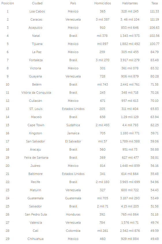 El Ranking de las 50 ciudades más violentas del mundo revela que 12 urbes mexicanas se encuentran dentro de las que registran los más altos índices de asesinatos: Los Cabos, Acapulco, Tijuana, La Paz, Ciudad Victoria, Culiacán, Ciudad Juárez, Chihuahua, Ciudad Obregón, Tepic, Reynosa y Mazatlán.