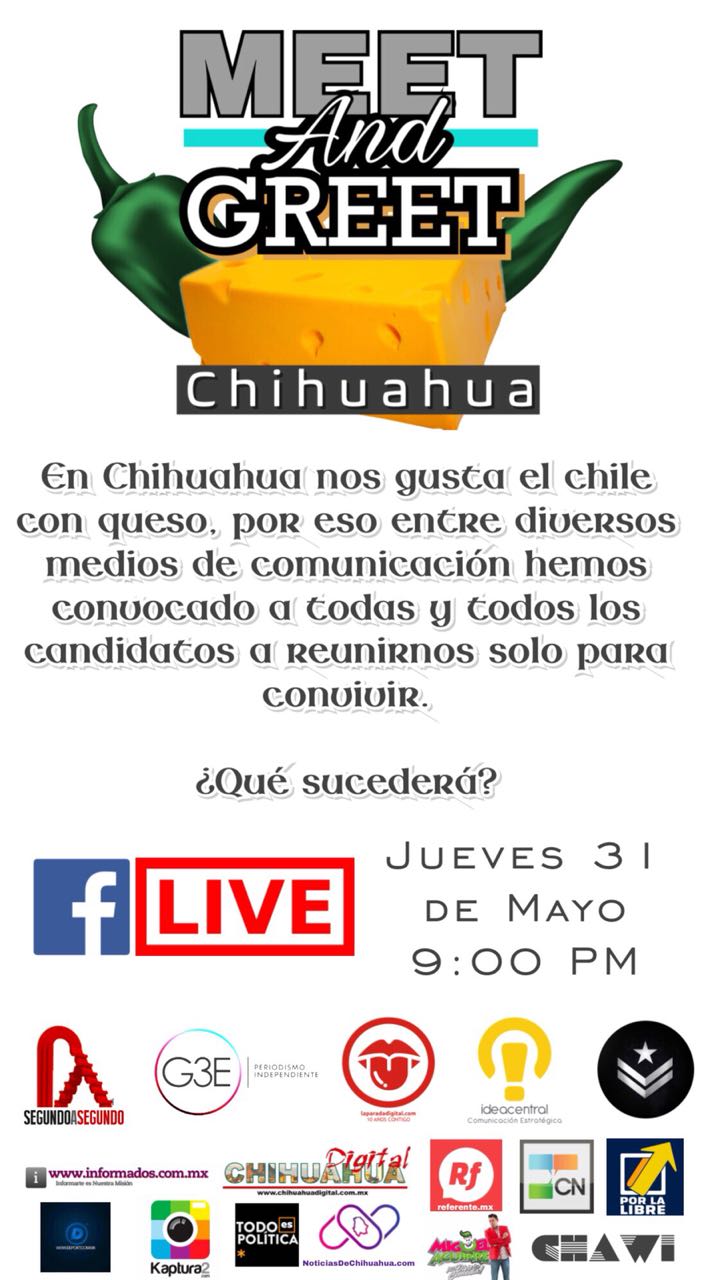 El próximo jueves 31 de Mayo a las 9 de la noche en el “Callejón Pulquería del Centro” ubicado en Calle Aldama y Séptima de la colonia Centro se han convocado a todas y todos los candidatos, aquellos que aparecerán en las boletas del primero de Julio, para reunirse y convivir en un “MEET AND GREET”, un evento informal de completo “relax” donde después de la ardua jornada laboral y propagandística, puedan escuchar buena música y tener un tiempo de esparcimiento con otros candidatos de distintos partidos políticos. No para debatir, ni siquiera para hablar de política, simplemente convivir, en civilidad política y para celebrar que somos chihuahuenses. Cabe señalar que más de 30 ya han confirmado esta invitación.