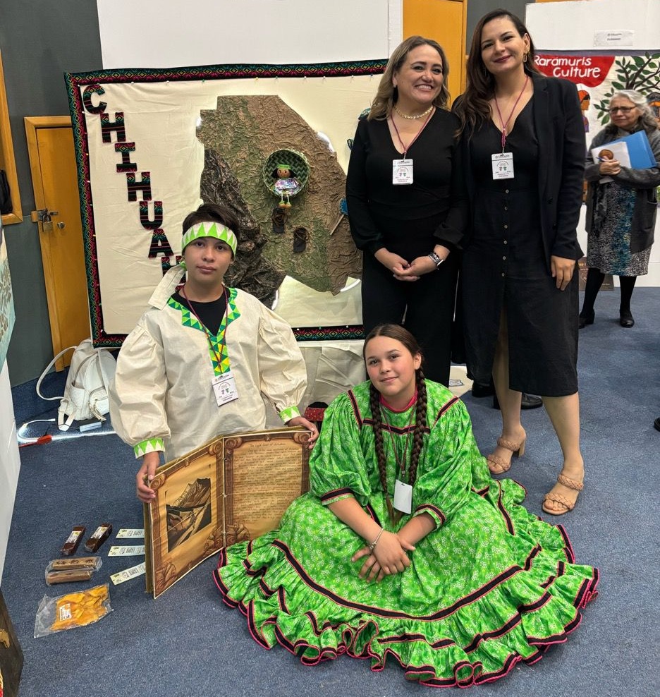 Como complemento a su narración, elaboraron un mural realizado con materiales reciclados y tela tradicional tarahumara, para dar un toque auténtico y artístico a su presentación.