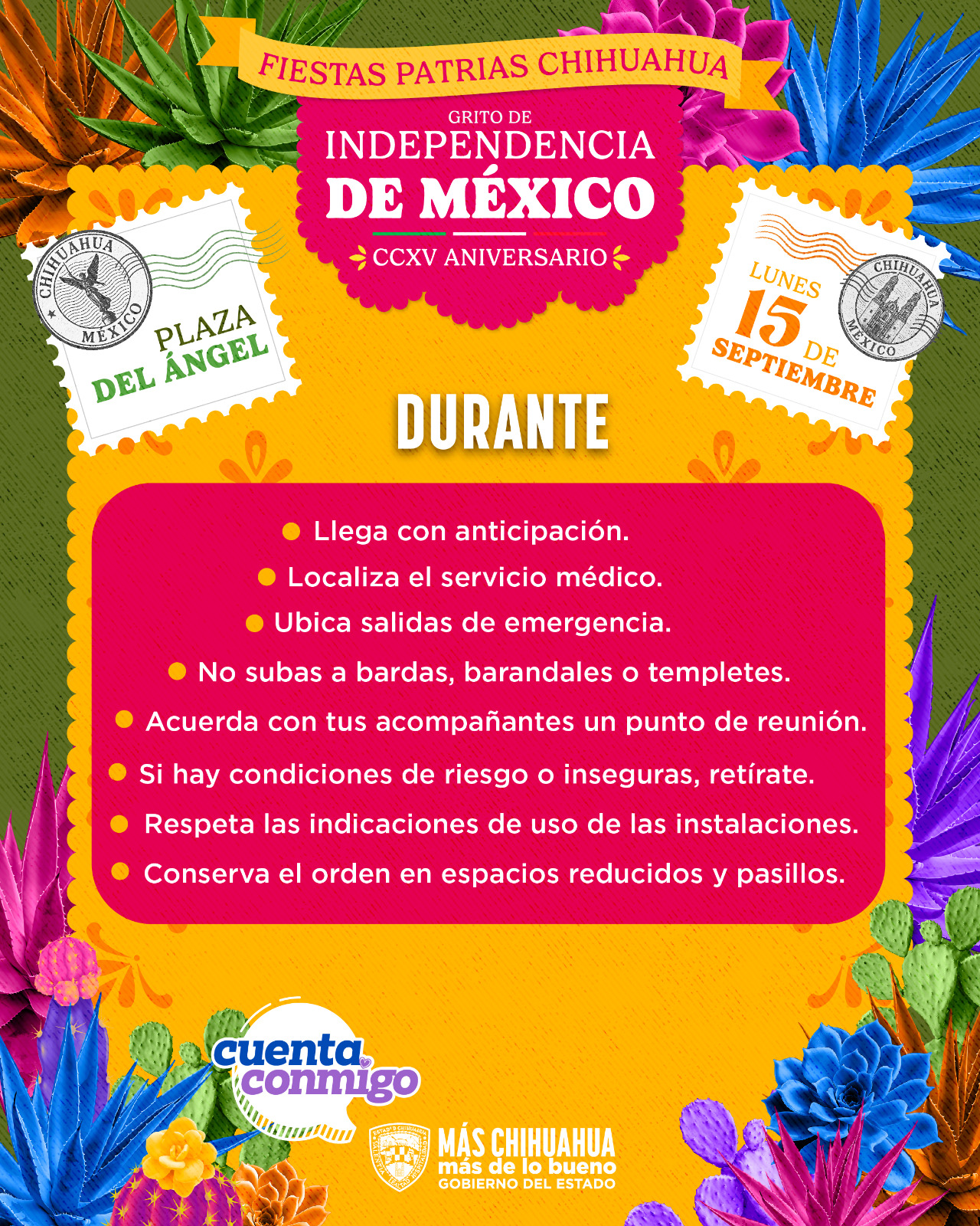 Con motivo de las celebraciones por el Grito de Independencia, la Coordinación Estatal de Protección Civil (CEPC) emitió recomendaciones dirigidas a la ciudadanía que planea asistir a los eventos en los 67 municipios del estado.
