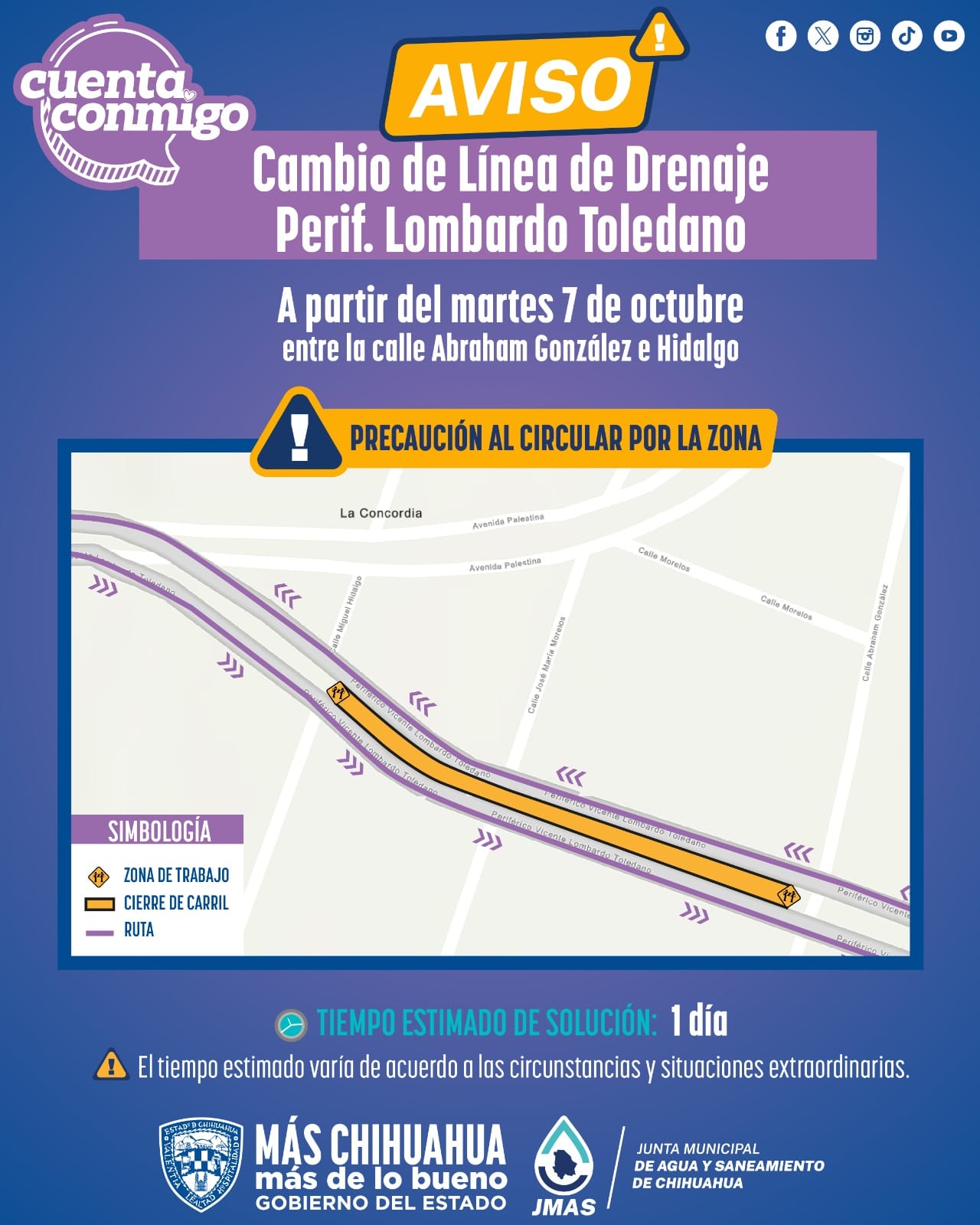 La Junta Municipal de Agua y Saneamiento (JMAS) de Chihuahua informó que, este martes 7 de octubre realizará los trabajos de reparación de un tramo de línea de drenaje dañada sobre el periférico Lombardo Toledano, a la altura de la calle Abraham González.