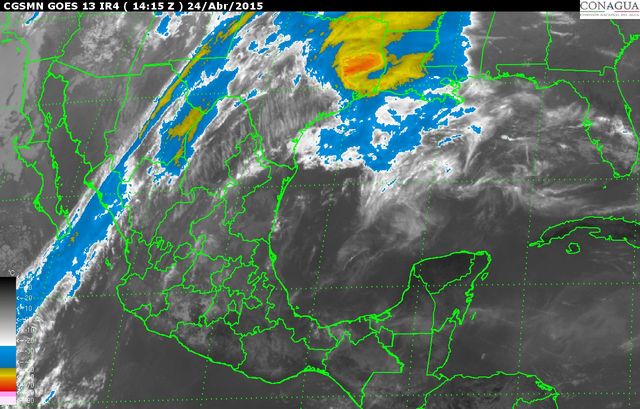 Otro canal de baja presión se extenderá sobre el noreste y oriente de la República mexicana y, en interacción con la entrada de humedad del Océano Pacífico y Golfo de México, originará precipitaciones fuertes de 25 a 50 milímetros (mm), acompañadas de tormentas eléctricas y granizo, en localidades de Tamaulipas y San Luis Potosí, así como lluvias (de 0.1 a 25 mm) en sitios de Coahuila, Nuevo León, Guanajuato, Querétaro, Hidalgo, Puebla, Tlaxcala, Estado de México, Distrito Federal y Veracruz.