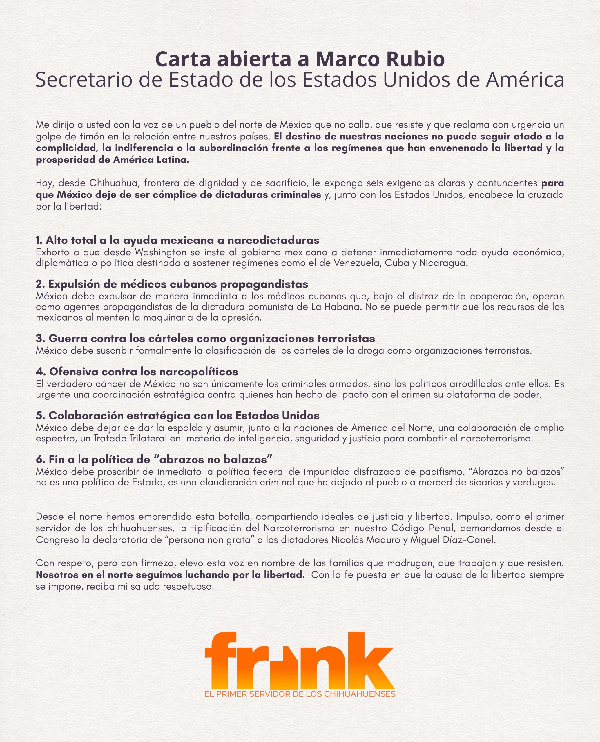 “Me dirijo a usted con la voz de un pueblo del norte de México que no calla, que resiste y que reclama con urgencia un golpe de timón en la relación entre nuestros países. El destino de nuestras naciones no puede seguir atado a la complicidad, la indiferencia o la subordinación frente a los regímenes que han envenenado la libertad y la prosperidad de América Latina”, enunció.