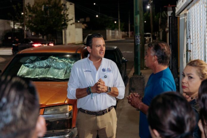 Chihuahua, Chih.– El alcalde Marco Bonilla recorrió las calles de la colonia Los Olivos para supervisar el funcionamiento del nuevo sistema de alumbrado público con tecnología LED, además de revisar el estado de las vialidades y la seguridad en la zona.